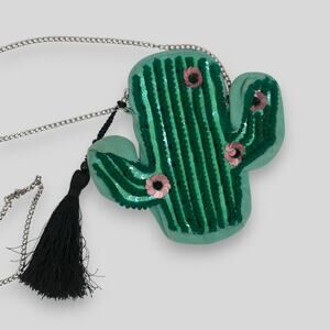 Adorable cactus-shaped crossbody bag from Circus by Sam Edelman. Covered in sparkling green sequins with pink flower embellishments.