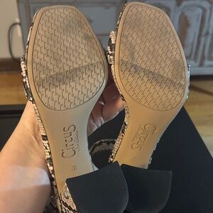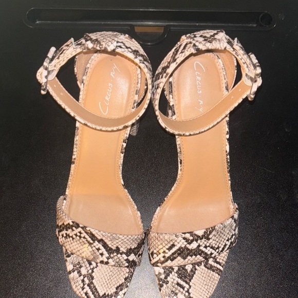 Stylish snake print heels with ankle strap. Perfect for a chic look.