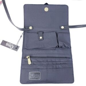 Cross-body strap. Interior zip pocket with additional slip pockets.