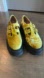 Stylish yellow velvet platform shoes with buckle details. Perfect for a bold fashion statement.
