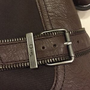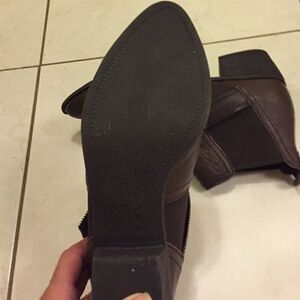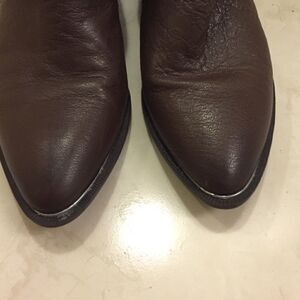 Brown leather slip on's, with a little steel accent around the toe. Shoes are like new. Heel is 1.5”