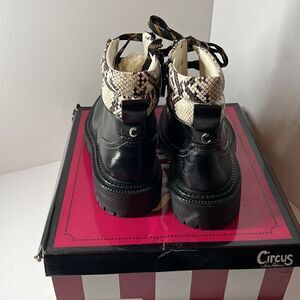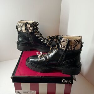 New in the Box Circus by Sam Edelman Flora Lug Sole Combat Boots size 8 Black Multi Snakeskin