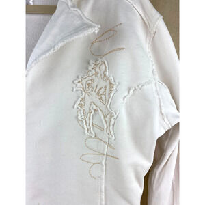 Love the deconstructed look of this jacket, with the raw seams and hem. Exaggerated sleeve length with a bit of a flare. Cirque Du Soleil printed along the one sleeve and embroidered applique on the chest. Full zip with flared collar. 100% cotton in a size XL. Fabric and construction are in excellent condition, but note there is staining along the sleeve hem, see photos.