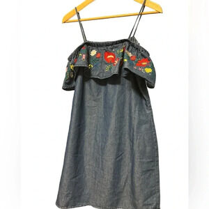 Cisono Denim Off the Shoulder Ruffle Mini Dress Embroidered Floral Detail Size M