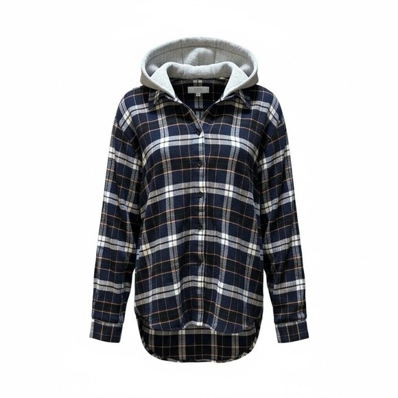 Cisono Womens Plaid Hooded Button-Up Shirt With Sherpa Lining Gray & Navy Checke