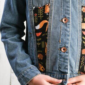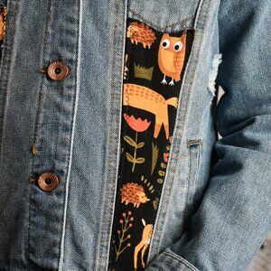 Unique, one-of-a-kind - upcycled Cisono Kids denim jacket. Girls 12, Fanciful woodland animals in fall colors on black background adorn this fabric and gives this jacket a unique super cute trendy look for the preteen/ teen set! Soft stretchy fabric. One purposely distressed spot on front right side. Machine stitched. Machine wash and dry.