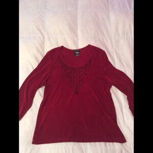 Fabulous bundle of 2 Citiknits blouses (Large, Red/Black) in their famous slinky, travel-friendly acetate knit! ✨ Perfect for your next cruise, holiday party, or special night out. Both tops feature gorgeous sequin details for a touch of glam! Proudly made in the USA. Lightly worn and freshly laundered.