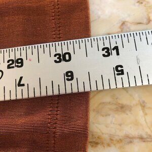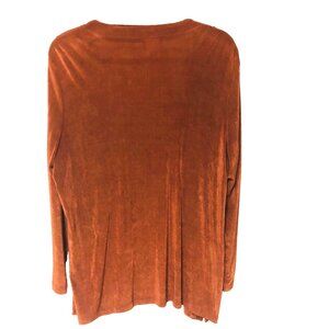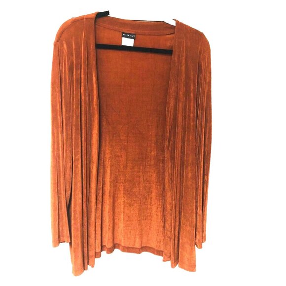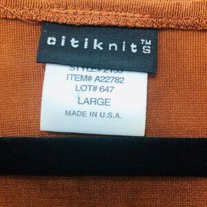 1013. Citiknits. Retired QVC. Good condition - missing shoulder pads; may have mothball storage odor, which dissipates with airing/laundering. Slinky fabric. Bronze. Open front. Long sleeves. Side slits. A22782. Size Large. Shoulder 16.75. Bust 45. Hip 47. Length 30.5. Experienced seller.