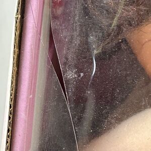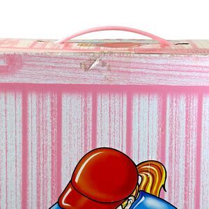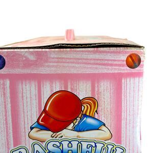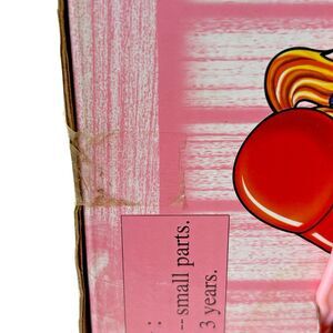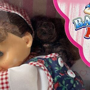 Vintage Y2K 2000 doll. She has brown hair and blue eyes. She is wearing a cap and blue floral overalls and red shoes. The doll is in her original package. The package has flaws and the plastic is torn. The package is not in collectible condition. The doll is unused.