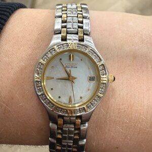 Citizen Corso two tone stainless steel and 14k gold watch with diamonds 💎 around the face of the watch. Watch face is mother of pearl. Eco drive equipped, and keeps the date of the month. Worn maybe 3 times total. Retailed for $715 when purchased, but citizen has since discontinued the two tone Corso watch. See video for condition, works great!! Great condition