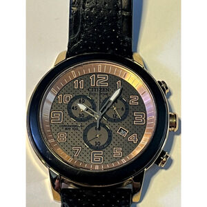 Citizen Eco Drive Chronograph Model WR100 Black Leather Strap Rose Gold Accent