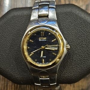 Elegant Citizen watch with a black dial and gold details. Sleek silver band design.