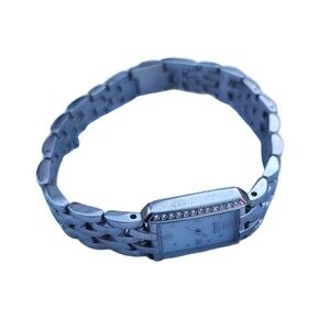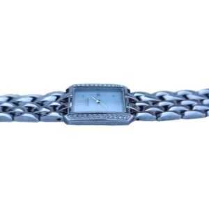 Details: Eco-drive movement, stainless steel case and bracelet, Swarovski or diamond accents, white dial, mineral crystal, water-resistant to 50m, no obvious flaws, however currently not holding a charge (most likely needs a cell replacement)
