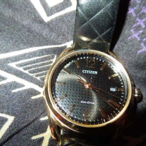 Solar powered watch in very good used condition with no scratches. The outside of the genuine leather band has light wear, the inside has more wear and staining.