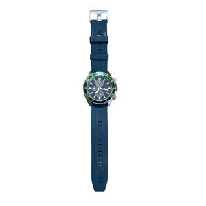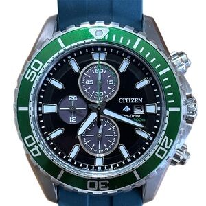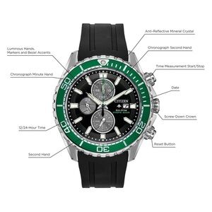 Proof that a dive watch can be fun & functional with the Citizen ISO-compliant Citizen Promaster Chrono Diver. With Eco-Drive technology, it is powered by light and never needs a battery, so you'll never need to open your caseback or compromise your dive again. This timepiece features a stainless steel case, black polyurethane strap with emerald green bezel and black dial, one-way rotating elapsed time, 1/5th-second chronograph, 12/24-hour time, date and divers 200M. Caliber number B612.