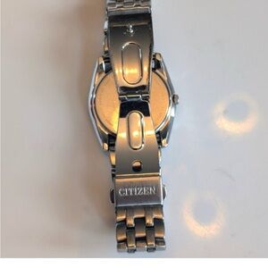 Elegant Citizen watch with a silver band and black dial. Features day and date display.