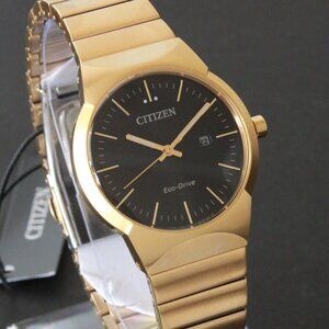 Axiom's refined yet sleek design offers a day-to-night fashion option for the avid trendsetter. This model features a gold-tone stainless steel bracelet with a three-hand black dial, gold-tone accents and date display. Featuring solar Eco-Drive technology – powered by light, any light. Never needs a battery. This watch is new, in the box and works perfectly.