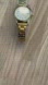 Description: Gold tone stainless steel stretch bracelet, gold tone hands and markers. White dial with day date windows. Quartz watch. Just cleaned and serviced with a new battery.