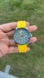 Stylish Citizen watch with a vibrant yellow strap. Features a detailed gray dial and chronograph function.