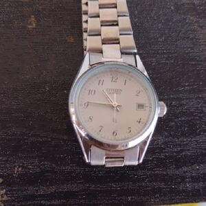 Elegant Citizen Quartz watch with a silver band. Classic design with a white dial.Shows very little wear or use it needs battery replacement