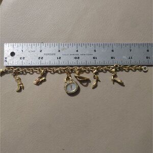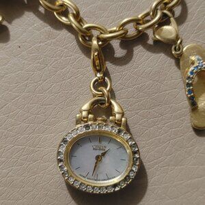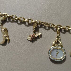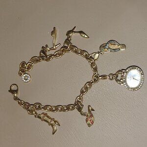 This vintage charm bracelet features a charming assembly of small shoe charms and a functional watch pendant, bringing a touch of nostalgic elegance to any wrist. Its gold-tone links and intricate detailing capture the essence of bygone eras, making it a unique collectible accessory for those who cherish vintage fashion.