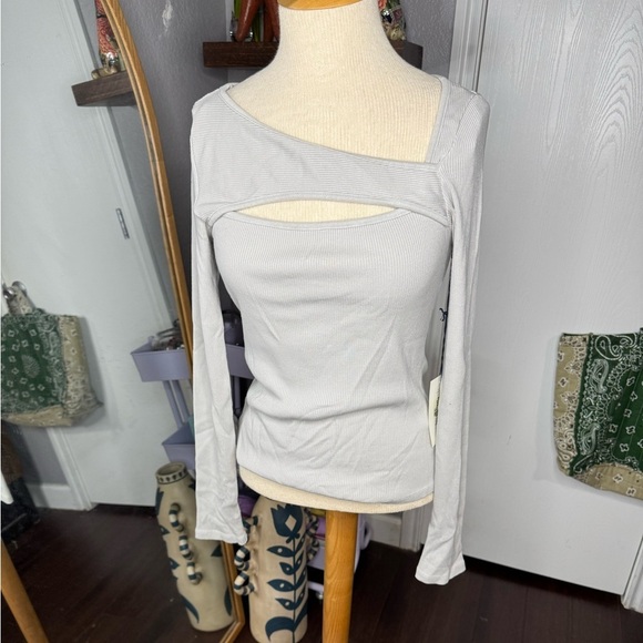 Stylish gray women's top featuring a unique cutout design. Perfect for a chic and modern look.