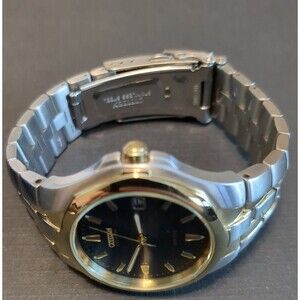 Sporty yet elegant, this two-tone model with black dial allows you to stand out from the crowd. Shown in stainless steel two tone, this 3-hand model feature a date indicator, luminous hands and markers, and 100M WR. Additional features include a 35mm case and foldover clasp with push button. Featuring our Eco-Drive technology – powered by light, any light. Never needs a battery. Caliber number E111.