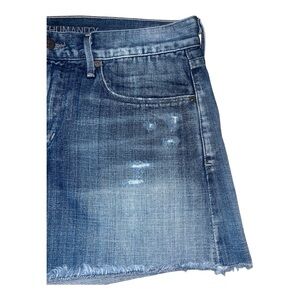 This mini skirt by Citizens Of Humanity showcases a medium to dark blue wash with a trendy distressed finish. The raw, frayed hem enhances its casual, lived-in appeal, making it a perfect choice for everyday wear. Enjoy the effortless style of this versatile piece, ideal for relaxed outings.