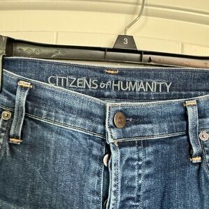 These Citizens Of Humanity jeans feature a timeless straight-leg cut in a rich blue hue. The denim showcases a naturally worn look with subtle fading patterns, offering a stylish and authentic appearance. Perfect for adding a touch of classic elegance to any casual ensemble.