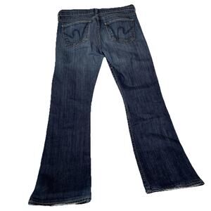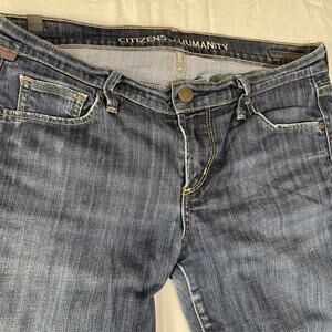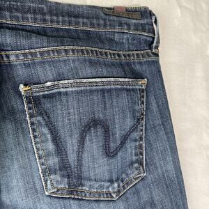 The product is a pair of Citizens of Humanity women's jeans in size 29, featuring a straight leg stretch denim style. Made of a dark wash denim fabric blend of cotton and elastane, these jeans have a low rise fit with a 5-pocket design and zipper/button closure. The blue color and solid pattern are accented with brand logos, making them a comfortable and stylish choice for any season. Made in the United States, these designer jeans offer a classic American look with a modern twist of stretch material for added comfort.