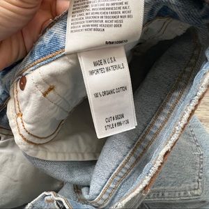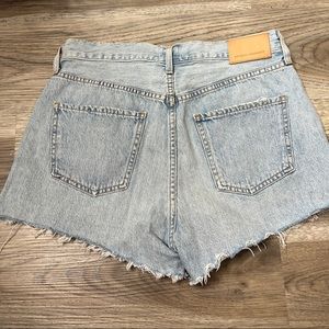 Stylish high waist shorts. Light blue denim. Frayed hem. Perfect for casual wear.