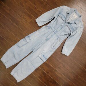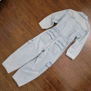 Stylish light blue denim overalls. Relaxed fit with long sleeves. Front zipper closure. Multiple pockets for convenience.