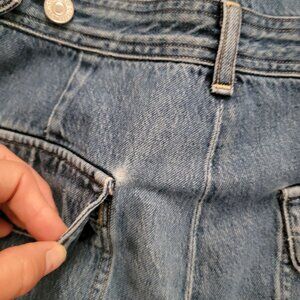 Small distress in material by back pockets. You can iron a patch on the inside to stop from distressing, if wanted. See photos