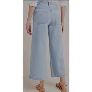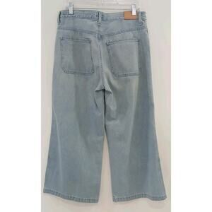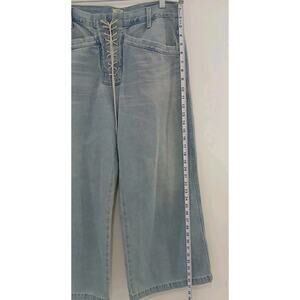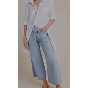 The Citizens of Humanity Nadia Ultra High Rise Wide-leg Jeans in size 29 are a stylish and versatile addition to any woman's wardrobe. Made from comfortable cotton fabric with a light wash, these solid blue jeans feature a unique lace-up and button closure. The wide-leg silhouette and regular fit offer a flattering and on-trend look, while the 27-inch inseam, crop length, and pockets add practicality to the design. These jeans are preloved and in good condition. Refer to photos for measurements.