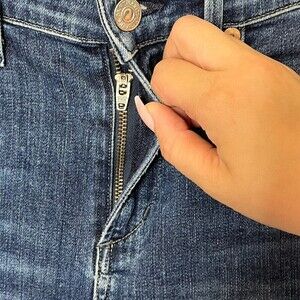 Features: High rise, cropped length, raw hem, light fading, distressed detail, 5-pocket design, zip fly with button closure, made in USA