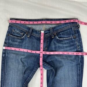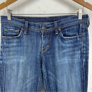 Citizens Of Humanity size 28 x 29 Y2K Ingrid Low Rise Flare Stretch Jeans #002. There is some light thinning in thighs ( not bad jeans are thick nowhere near ripping) and there is some distressing at hems.