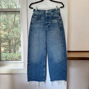Citizens of Humanity Ayla Raw Hem Crop Jeans in Doheny — medium wash indigo denim with a raw hem, subtle fading, and relaxed wide-leg crop silhouette.