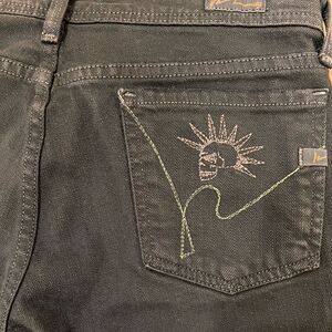 Black Citizens of Humanity denim with skull mohawk details on back pocket. Size 27. Cut #3614 Style #147B-001 98% cotton, 2% polyurethane.