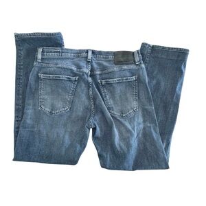Features: men’s slim straight jeans, medium wash denim, stretch jeans, classic 5-pocket, zip fly, belt loops, made in USA, Citizens of Humanity CORE, Jerome Dahan, W34 L28, altered hem.