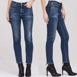 98% cotton, 2% polyurethane, Whiskering and fading along front Intentionally destroyed areas throughout, left ripped knee, 14" at the knee narrows to 12" at the leg opening. Great pre-owned condition! Approximate measurements when laid flat waist 14 inches rise 10 inches inseam 26 inches