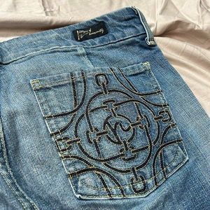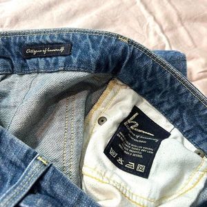 Faded blue jeans with flare leg.