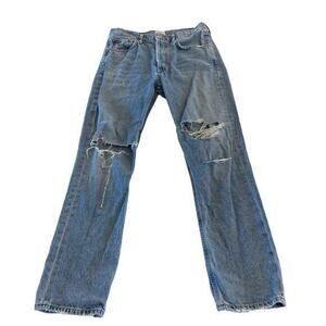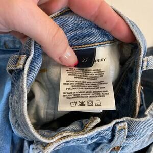 In good used condition. No stains. Button fly. High waisted. 28" inseam. Distressed. Women's size 27.