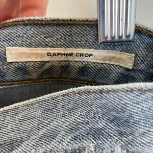 Medium-light wash Daphne Crop Jeans by Citizens of Humanity. With purposeful distressing and raw hems, high rise. Please note that these jeans have an "as is" where the back brand tag had some color bleeding onto the denim - you can see the effects of this in the last four pics. Rise measures approx. 11.5 inches. Inseam measures approx. 26.5 inches.