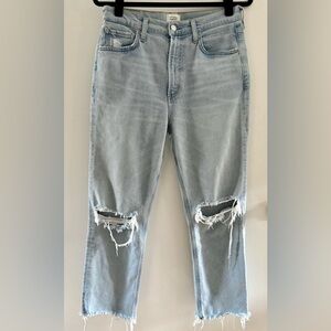Citizens of Humanity Daphne High Rise Stovepipe Crop size 28 Blue Ripped knees and distressing. Soft stretch denim with ripped knees and distressing. Good used condition, see pics for approximate measurements. Inseam is approximately 27”