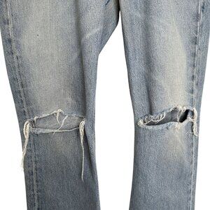 Knee rips and frayed hems show wear as do seams on inner legs, 1 spot on left front thigh