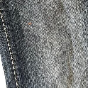 Please see pics for flaws on back left pocket area, front left leg and front right leg.