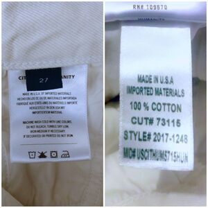 Notes: Some faint light green marks going across the front and part of the waistband on one size and the other only the pocket. Light gray spots on the back above pocket and on pocket, center lower seam and multiple spots on both back legs.View photos.