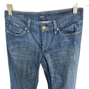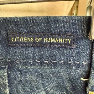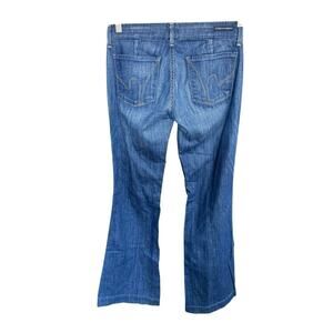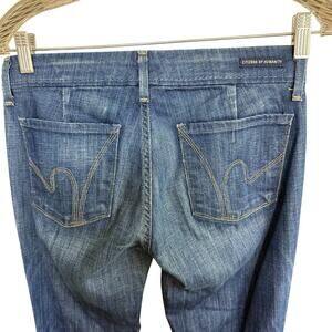 The product is a pair of Citizens of Humanity Women's Faye Stretch Low Rise Full Leg Flare Jeans in size 26. These jeans feature a zip closure, belt loops, and a 5-pocket design. They are made from a denim fabric with a solid blue color and a medium wash. The jeans are designed with a flared leg opening and a slimming fit, offering comfort and stretch for everyday wear. The brand Citizens of Humanity is known for its modern and classic styles, making these jeans a versatile addition to any wardrobe.