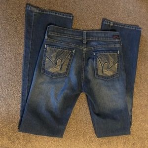 Beautiful Blue, Citizens of Humanity Jeans w/ Yellow Stitched Logo.  Very Rare and Unique.  Label size- 28.  Dimensions are as follows:  waist- 27", front rise- 7.5", inseam- 32.5", length- 40" and leg opening- 8.5"