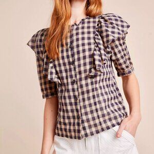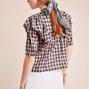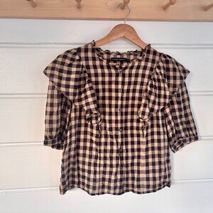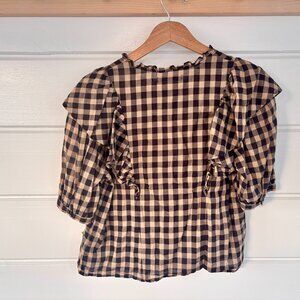 Very good pre-owned condition! Ecru and navy checked blouse is very lightweight, with a button front and slightly puffed, button-cuff sleeve. Size Medium. Timeless but super on-trend for this season!